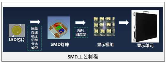 主要工藝流程是將LED發光芯片封裝于支架內形成燈珠(SMD表貼件),燈珠通過焊錫再貼于PCB板。再將表貼件及PCB板放入高溫烤箱內進行燒結凝固(回流焊),然后通過壓焊技術對LED進行引線焊接,最后用環氧樹脂對支架進行點膠封裝,最終形成顯示模組,模組再拼接成單元。
