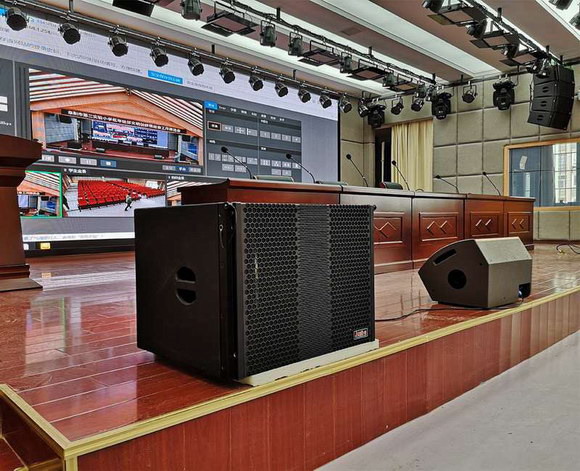 廳內主擴聲采用的是線性陣列音箱,主席臺/舞臺區左右各掛4只高精度全頻音箱,最大聲壓級130db,動態容量大、聲像定位準確、投射精準、音質優美;輔助音箱搭配的2只雙12寸遠射程強低頻效果的次低音和2只90°圓錐指向性舞臺返聽音箱。主輔的搭配完美解決臺前臺后各區域聲場分布不均勻,語言清晰度低,響度不夠的問題,在任何的演繹方式下都能擁有出色的表現力。