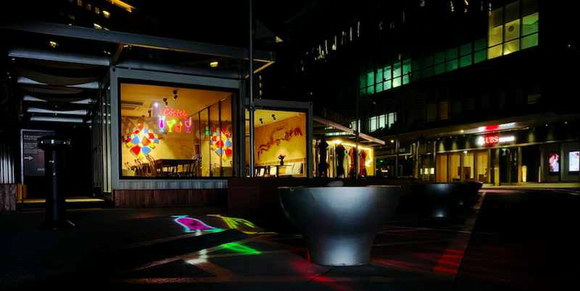 一般的餐廳都會配備大型落地櫥窗,在不影響白天采光及原有空間設計的情況下,可以通過投影+投影膜的組合方式,將普通的落地窗在夜晚瞬間化身無邊界的顯示屏幕,通過在落地窗上投射生動的創意影像吸引行人的關注,為店面增加客流。愛普生LightScene投影燈把經過創意設計的“霓虹燈”風格的圖形元素投射到玻璃上,將美食與美酒巧妙融合,呈現出藝術多元化的同時還能吸引更多人的關注,為店面帶來更多客流。