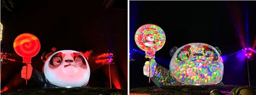 每到夜幕降臨,華燈初上,熊貓主題夢(mèng)幻兒童樂(lè)園一只手拿棒棒糖的可愛(ài)大熊貓立馬被“復(fù)活”,璀璨絢爛的“光影”外衣照亮了美嶺湖的夜空。在高12米,寬18米的巨大雕塑熊貓進(jìn)行投影,實(shí)現(xiàn)難度遠(yuǎn)大過(guò)戶(hù)外普通建筑投影。此次,引領(lǐng)了激光工程投影技術(shù)創(chuàng)新的國(guó)際顯示品牌NEC,以2臺(tái)4萬(wàn)流明、真4K雙色激光投影進(jìn)行雙機(jī)疊加,將亮度更高、畫(huà)面更大、顏色更靚麗、畫(huà)質(zhì)更清晰的圖像疊加在熊貓雕塑上,為大熊貓賦予了鮮活生命,成為了瓊海夜晚的一道亮麗風(fēng)景線。