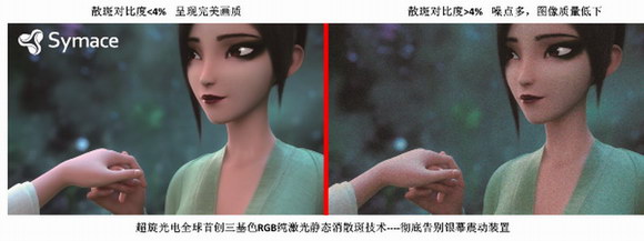 Symace®超旋光電獨創的自主專利,采用三基色直連式解決方案,實現無需抖屏的靜態消散斑,是行業里獨一無二的創舉。通過在光路中加入組合光學器件的方式,使光線的相位產生差異,從而降低激光的相關性,從此告別光斑干擾,告別銀幕振動裝置,告別高昂的價格和復雜的操作。