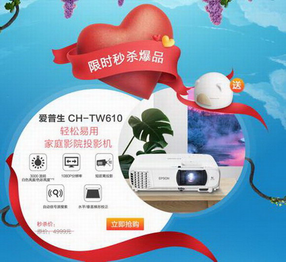 除了愛普生CH-TW610外,2019年5月21日-5月26日期間,上京東愛普生官方旗艦店購買以下投影機型,均有機會獲得小豬拍拍燈一個,數量有限,先到先得哦!