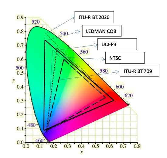 唯一比基于COB技術(shù)的Micro LED微顯示色域范圍更高的是ITU-R BT.2020色域,是基于Micro LED微顯示色域的118.92%,ITU-R BT.2020標(biāo)準(zhǔn)也是8K視頻要求的色域范圍。目前基于COB技術(shù)的Micro LED微顯示的色域范圍,如果要接近或達(dá)到ITU-R BT.2020標(biāo)準(zhǔn)的色域范圍,相對(duì)來說是比較容易實(shí)現(xiàn)的,從Micro LED微顯示的彩色顯示原理可以清楚看到,基于COB技術(shù)的Micro LED微顯示,采用紅、綠、藍(lán)三色LED芯片混光來實(shí)現(xiàn)彩色顯示,從圖2可以看到,LEDMAN COB的色域三角形,與ITU-R BT.2020的色域標(biāo)準(zhǔn)相比,主要是LED綠光芯片的波長(zhǎng)范圍有些差異,可以通過與芯片廠家協(xié)同開發(fā),調(diào)整紅、綠、藍(lán)三種LED芯片的波長(zhǎng)范圍及其他參數(shù),就可以做到盡量覆蓋ITU-R BT.2020的色域范圍,相對(duì)來說是比較容易實(shí)現(xiàn)。因此基于COB技術(shù)的Micro LED微顯示可以實(shí)現(xiàn)接近或達(dá)到ITU-R BT.2020的色域范圍,色域越大,能夠表現(xiàn)的顏色更豐富,更能還原自然界千姿百態(tài)的顏色。