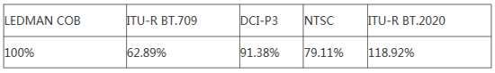 從下表中可以看到,雷曼基于COB技術(shù)的Micro LED微顯示色域?yàn)?00%時(shí),ITU-R BT.709的色域范圍只有Micro LED微顯示的62.89%,NTSC的色域范圍只有Micro LED微顯示的79.11%,DCI-P3的色域范圍只有Micro LED微顯示的91.38%。