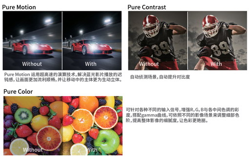 畫質(zhì)是Optoma ZK1050/ZK750的優(yōu)勢(shì),它們支持MEMC,Pure Contrast可自動(dòng)偵測(cè)場(chǎng)景,自動(dòng)提升對(duì)比度;Pure Color可針對(duì)不同輸入信號(hào),增強(qiáng)RGB與各中間色的彩度,并依照不同影像場(chǎng)景調(diào)整細(xì)部色階,提高整體影像細(xì)膩度。Pure Motion運(yùn)用超高速的演算技術(shù),讓畫面更加流利順暢。其還支持HDR10高動(dòng)態(tài)范圍技術(shù)。