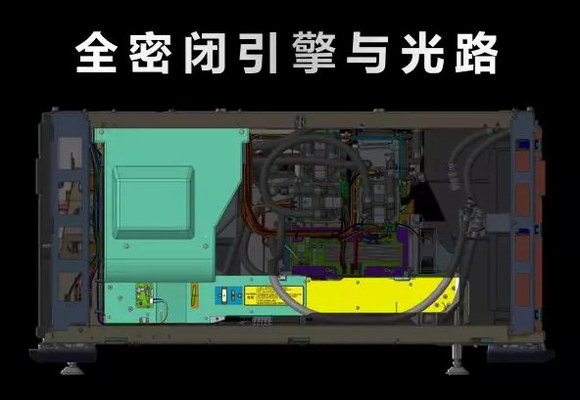 不僅是對光源,整體冷卻系統(tǒng)還負責(zé)引擎部分的降溫,最大程度的對光路整體結(jié)構(gòu)保駕護航。全新的整機工程設(shè)計,將冷卻和散熱系統(tǒng)集成在機身內(nèi)部,不再需要外置液冷箱,從而實現(xiàn)all-in-one的設(shè)計。