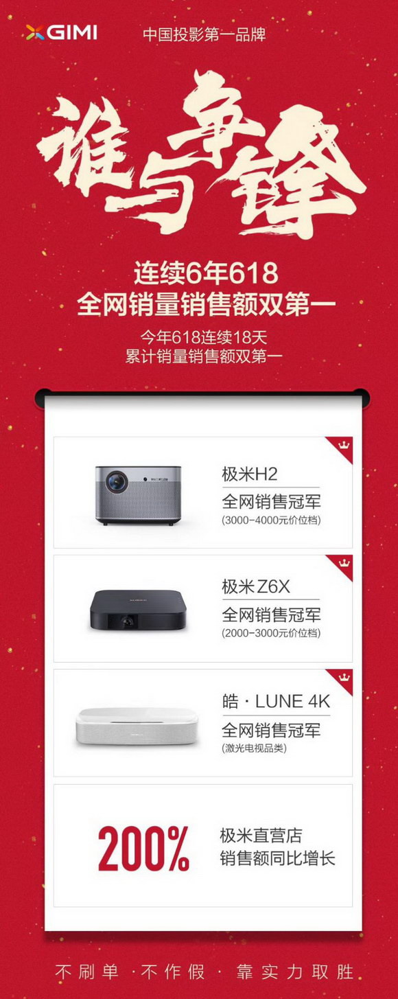 今年618促銷季,極米再次獲得同品類全網銷量銷售額雙第一,這是極米自2014年首次參加618以來第6次奪冠。今年從6月1日到6月18日,極米連續18天保持銷量銷售額雙第一,極米智能投影H2和Z6X分獲3000-4000元、2000-3000元價位段投影銷售冠軍,極米激光電視皓. LUNE 4K獲激光電視銷售第一。不僅電商平臺戰績斐然,極米直營門店銷售額也較去年同期實現了200%的增長。
