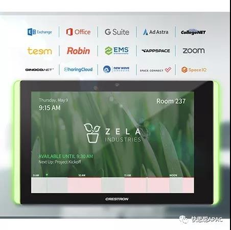 快思聰觸摸屏不需要額外軟件或硬件,原生接入Microsoft的Exchange Server ®,Office 365 ®, G Suite®,Ad Astra和CollegeNET。原生Crestron房間日程安排軟件提供各種品牌和自定義選項(xiàng),包括HTML5支持。此外,在InfoComm 2019上展示了原生支持New Wave Apps,SpaceIQ,Teem®,Robin®,AppSpace®,EMS和Zoom Rooms™,Gingco,NFS,SpaceConnect和SharingCloud日程安排軟件應(yīng)用。