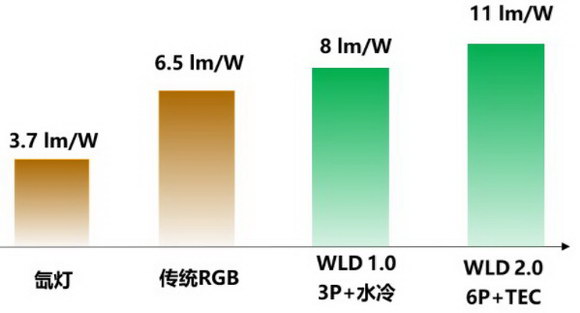 WLD白光激光是將RGB半導體激光在模塊端就實現混光,輸出穩定亮度與穩定色溫的白光激光,每個白光模塊內部都有獨立的驅動、散熱、白平衡控制,因此可實現激光完全模塊化,實現不偏色、不停映的保障。