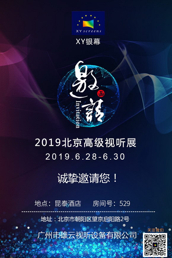 由HIFI說主辦、中國北方規模最大的影音綜合展——HAVE 2019北京高級視聽展,將于2019年6月28、29、30日在昆泰酒店(北京朝陽區望京啟陽路2號)舉行。XY銀幕在昆泰酒店529房間。