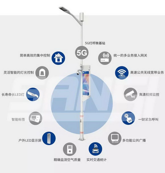 智慧路燈采用“共享燈桿”的方式,集成了公共WiFi、視頻監控、公共廣播、溫度監測、濕度監測、風速監測、空氣質量監測、緊急呼叫、信息發布等功能。