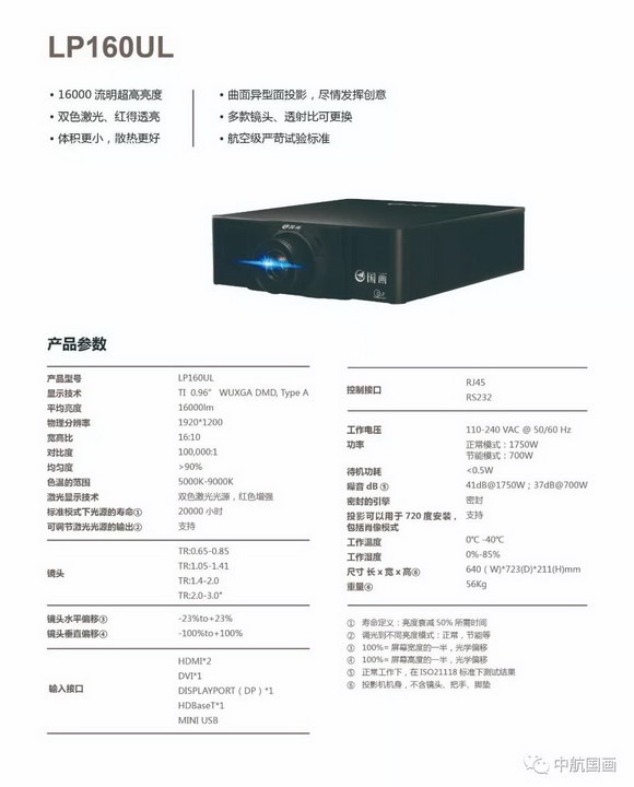 中航國畫LP160UL高亮度雙色激光工程投影機 ,投影高亮高達16000流明,在國內居于領先水平