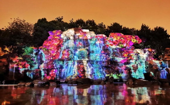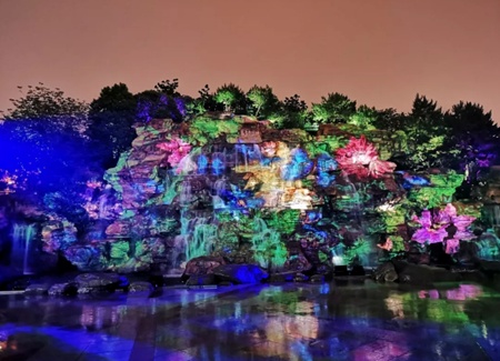 本次項目投影的內容包括中華文化中經常出現的花草元素,例如牡丹、繁花、蝴蝶、神鹿等,以優美的景致展現了自然的美麗與寧靜。憑借贏康的大師級投影設計,影像內容與石園飛瀑異曲同工地融為一體,靈動的畫面為夜下的大唐芙蓉園增添了一抹瑰麗的亮色。
