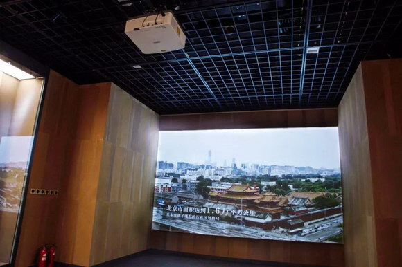 位于展廳最北端的“北京市轄區及平原”以PA653UL+投出的寬4.8米、高2.7米的超大畫幅向觀眾精準的呈現出北京平原和轄區的結構劃分,高清的畫面使地圖中的每個細節清晰可見。