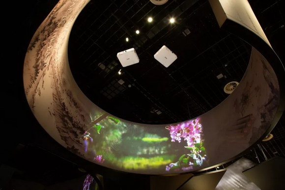展項由4臺P525UL+打造, 以2臺融合、2臺單投的形式在半展開的仿古畫卷留白上投射畫面,長卷與觀眾成70°夾角,觀眾向上凝望感受無比新奇,投影畫面與整體畫面既融為一體,又能脫穎而出,仿佛一副活著的古卷。