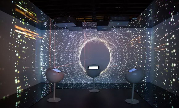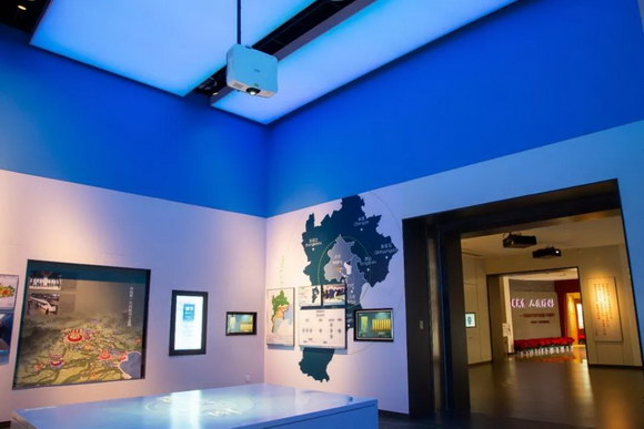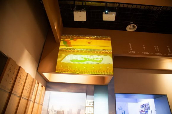 4臺7500流明的PX753UL+分別向三面墻體投射,形成沉浸式的三折幕,此展項的點睛之筆在于地面和頂棚采用了鏡面處理,讓沉浸感多了一個維度,整體畫面的統一性非常強。作為結束展項也呼應了主題,反映了當下的繁榮,為整個導覽畫上了完美的句號。