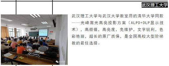 近年來,武漢多所高校選擇光峰品牌為其提供多媒體顯示設備,如武漢大學先后采購光峰激光投影方案300余套,其采用最多的是光峰激光高亮投影方案,對使用效果非常滿意。