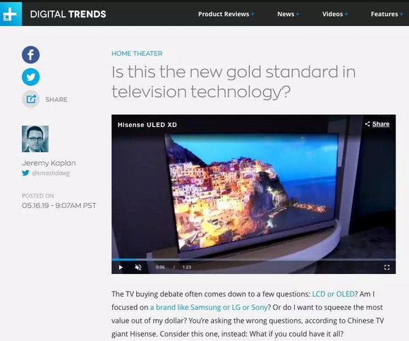知名科技媒體Digital Trends專門撰文疊屏電視海信ULED XD進行了報道:電視技術新的黃金標準?液晶還是OLED?三星、LG,還是索尼?中國電視巨頭海信:這些問題你都問錯了!何不考慮這個問題,如果以上這些你都擁有呢?
