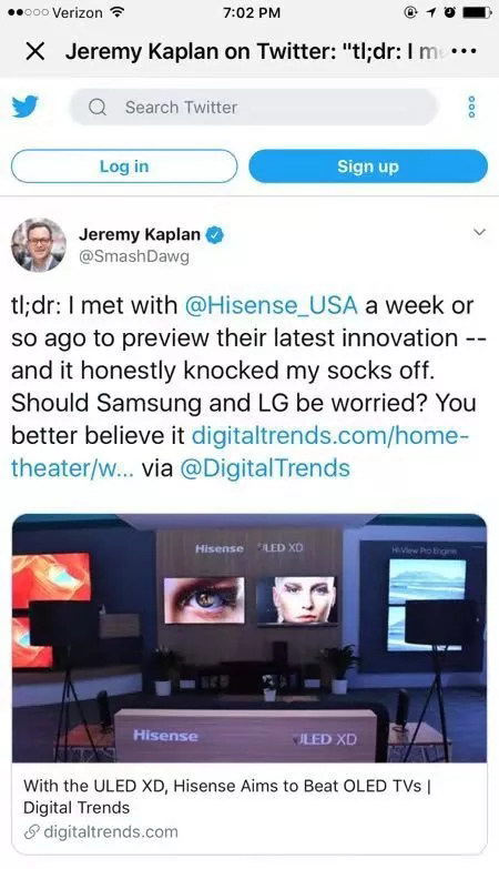 該媒體總編輯Jeremy Kaplan還專門發布twitter點贊疊屏電視:“我大約一周前提前見到了海信的最新產品——它確實讓我大為震撼。三星和LG是否該焦慮不安了呢?你們最好相信確實如此。”