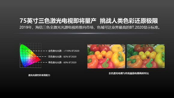 據(jù)介紹,海信自主研發(fā)的三色激光電視也叫全色激光電視,其所有的顏色均由激光產(chǎn)生,沒有任何色輪的補充,能夠輕松達到業(yè)內(nèi)最高的BT.2020標(biāo)準(zhǔn),色彩表現(xiàn)力超過了人類已知的其他顯示方案,可以最大程度地還原自然色彩。“在運用三色激光顯示技術(shù)同時,這款電視也是業(yè)界首次將激光電視下探到75吋,技術(shù)難度超乎想象。” 高玉嶺表示。