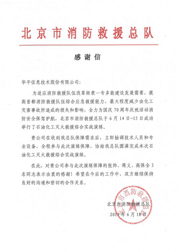 演練結束后,總隊領導對華平的設備和保障給予了高度的評價和認可,北京消防救援總隊給華平發來感謝信!