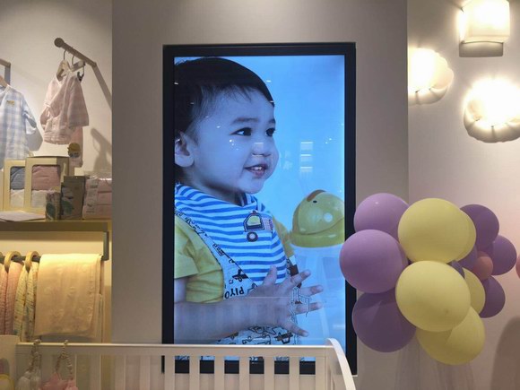 現(xiàn)如今的母嬰品牌零售門店,不同于十年前宛如超市的布局,個性化設(shè)計(jì)風(fēng)格越發(fā)突出。步入好孩子gb的門店,首先映入眼簾的是一整面墻的新興營銷展示工具——電子海報(bào)。其由明基拼接顯示屏為硬件載體,亮麗的液晶顯示效果加上2×2的拼接疊加,遠(yuǎn)距離觀看依然是矚目的焦點(diǎn),試想一下:兩家比鄰的門店,一家正播映著精致的廣告視頻,而另一家只能展示靜止不動的傳統(tǒng)燈箱廣告,辣媽的眼球會被誰吸引?