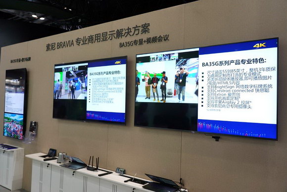 展會現場,雙方對合作產品進行了展示。本次展出的數字標牌及會議室解決方案,均使用了索尼今年新推出BRAVIA專顯BA35G系列產品。該系列不僅具備專業商用顯示所需的基本性能,如網絡連接、安裝選項靈活等特點,還配備專業模式(Pro 模式),用戶可根據使用需求定制顯示設置。同時,BA35G系列產品搭載的新型軟件平臺充分利用了內置CPU/GPU和視頻解碼器的性能優勢,將計算機/機頂盒/切換臺的部分性能集成到一臺顯示屏中,系統更加簡化,降低了總體擁有成本。