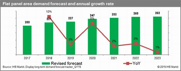 IHS Markit日前將其2019年平板顯示器出貨量需求預(yù)測下調(diào)2.1個百分點,至2.27億平方米,低于此前預(yù)測的2.32億平方米。