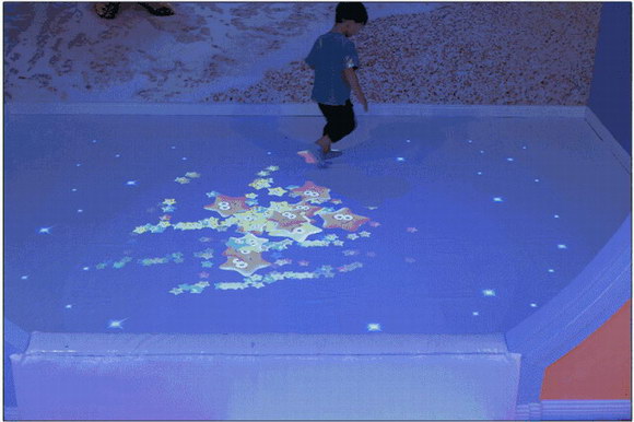 地面互動投影采用懸掛在頂部的投影設(shè)備把影像效果投射到地面,當參訪著走至投影區(qū)域時,通過系統(tǒng)識別,參訪者可以直接使用雙腳或動作與投影幕上的虛擬場景進行交互,互動效果就會隨著你的腳步產(chǎn)生相應(yīng)的變幻。