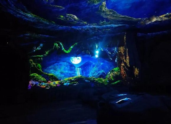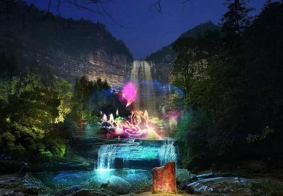 在完全保護景區(qū)原始景觀的前提下,將懸崖峭壁、飛流瀑布,螢火森林等壯觀景色在夜色中綻放出另一番意境。
