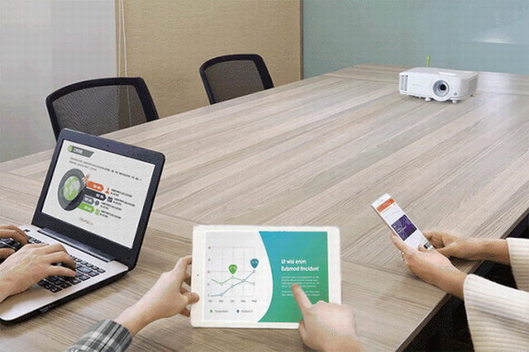 在這時候,我們就無比懷念起智能手機自帶的無線投屏系統,但實際上明基早已想到這一點,在無線連接功能的加持下,我們根本無需再去糾結線材、接口、插拔的問題,只需要將投影機與電腦、手機等智能產品添加至同一無線網絡下,便可以輕松實現一鍵投屏。而如果身處無網絡環境,明基E系列商務投影機還可以化身為網絡熱點,直接將智能手機接入,便可以輕松完成無線投射。