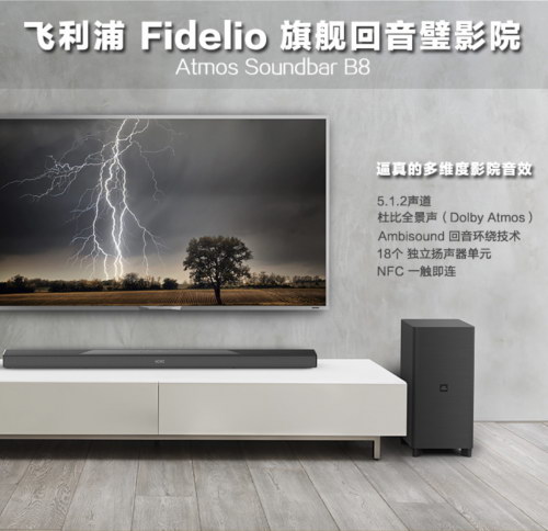 飛利浦高端支線Fidelio系列目前的產品為Fidelio B8,后續會有更多新品加入其中,Fidelio B8是5.1.2聲道Atmos Soundbar影院系統,除傳統5.1聲道外另有2組向上發射聲音的揚聲器單元,將聲音向天花板發射,讓聲音體驗具有高度感。此外Fidelio B8內置了三種聲音模式,分別為Movie模式、Voice模式以及Music模式。Movie模式下會感覺更有空間感,看電影時自然推薦使用該模式,能獲得更具臨場感的感受。Voice模式明顯突出了人聲的表現,人聲離觀眾更近,在日常看電視節目時可以切換到該模式。Music模式突出的是音樂在中高頻方面的表現,聲音的解析力全面提升。 Fidelio系列作為殿堂級的Soundbar,勢必會得到消費者的青睞。