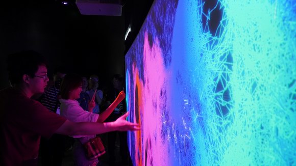 現場,索尼視聽結合,借助六塊BRAVIA專業商用顯示BA35G拼接墻體屏幕,三臺6100流明VPL-F636HZ投影機向地面投放高畫質視頻,立體化展示不同場景下的應用方案。在模擬展覽館方案時,觀眾可在一幅展品前方的三個位置,分別聽到中文、英文、日文三種語言解說,互不干擾。當畫面轉換,觀眾又被置身于對應的立體聲場中,比如,屏幕展示森林綠地,風聲、雨聲、鳥鳴聲、樹枝搖曳聲,就會從聲場的不同位置傳來。隨著畫面和聲場的轉換,觀眾可體驗不同時空的真實感,在靜謐的海底、激昂的音樂會、法國大革命等不同場景中“穿越”。