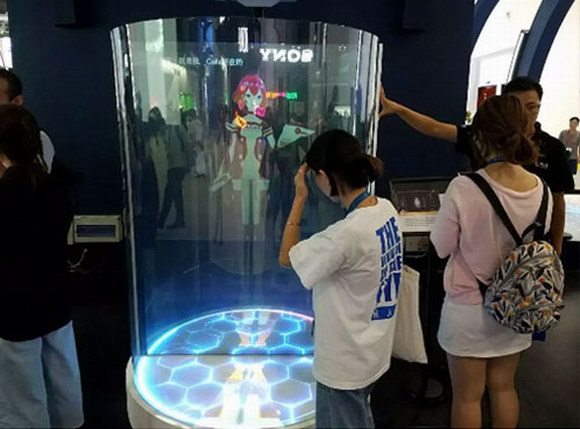 此展區(qū)以模擬仿真投影為靈感,在透明柱形空間中對半透明玻璃進(jìn)行投影,從而獲得影像懸浮于空中的全息般視覺效果。其中,投影屏幕采用了麥克賽爾研發(fā)的業(yè)內(nèi)領(lǐng)先的具備隔熱阻熱功能的半透明屏幕膜,實用性和美觀度兼具。卡通人物的可愛造型和虛幻漂浮的效果,讓展項前的觀眾不時舉起手機拍攝。