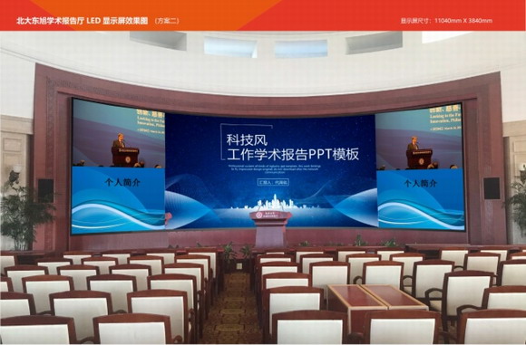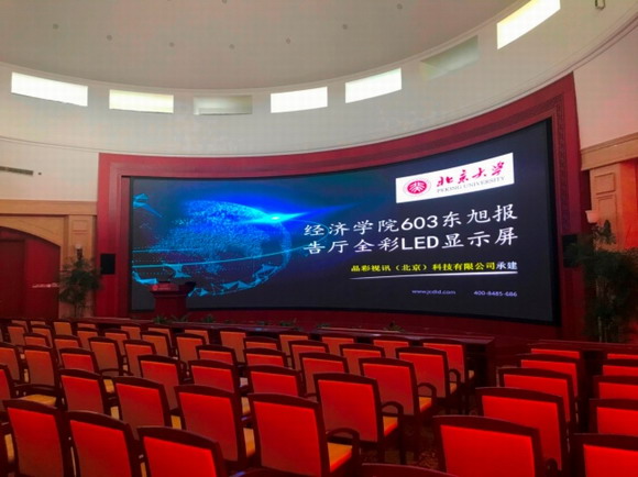 北京大學(xué)經(jīng)濟(jì)學(xué)院緊隨科技信息化教學(xué)的腳步,計(jì)劃將院校內(nèi)報(bào)告廳的陳舊投影設(shè)備更新?lián)Q代;校區(qū)負(fù)責(zé)人在多方對(duì)比,展廳考察后,最終選擇了專業(yè)做顯示系統(tǒng)的生產(chǎn)廠家--晶彩視訊,并提出整改報(bào)告廳顯示設(shè)備的訴求;經(jīng)過多次的溝通面談,晶彩視訊的高級(jí)工程師用多年來積累的經(jīng)驗(yàn)和專業(yè)知識(shí)為北京大學(xué)經(jīng)濟(jì)學(xué)院東旭報(bào)告廳設(shè)計(jì)了47.9平方的LED小間距拼接顯示方案;該方案采用了P1.875小間距拼接顯示屏,解決了會(huì)議中投影不能分屏多畫面顯示、清晰度低,對(duì)環(huán)境光線要求高的問題。