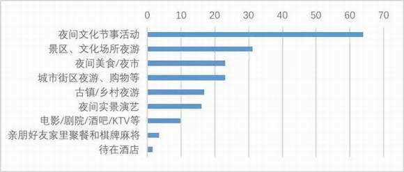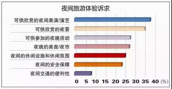 在游客夜游體驗需求種類方面,《報告》顯示,游客對景色、活動、餐飲、休閑等夜游要素的訴求相對均衡,35.7%的游客關注可供欣賞的美景,對夜晚活動、休閑氛圍、安全保障、美食(夜市)的訴求比重分別在23%-28%之間。其中,文化體驗已成為夜間旅游的重要組成部分,書店、茶社、劇院是夜間消費市場的文化亮點。