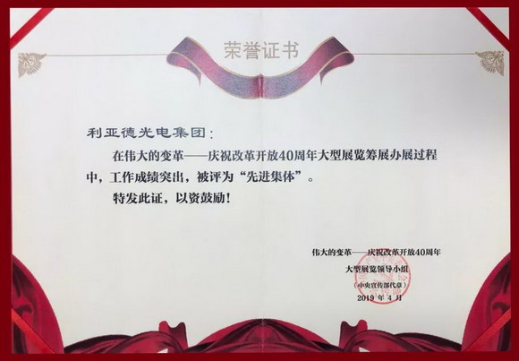 日前,由中央宣傳部、中央改革辦等單位組成的“偉大的變革——慶祝改革開放40周年大型展覽”工作小組,對在展覽籌備及舉辦過程中做出突出貢獻的單位和個人予以了表彰。利亞德集團憑借為本次展覽提供的優質顯示產品,獲評“先進集體”。