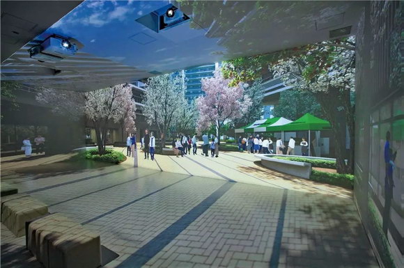 ▲五面大型影院,用投影機在墻壁、地板、天花板上投射“晴海FLAG”的寬敞舒適的生活。可以體驗到實際生活在街區(qū)般的現(xiàn)場感。