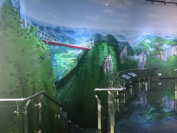 特別是臺地峽谷展廳,獨辟蹊徑,設計師充分利用建筑接近15米的層高,通過仿真藝術造景、大型手繪油畫和雕塑模型等造景手段,采用360度全景設計手法,為觀眾營造出猶如置身真實湘西臺地峽谷山水環境之中的感受。