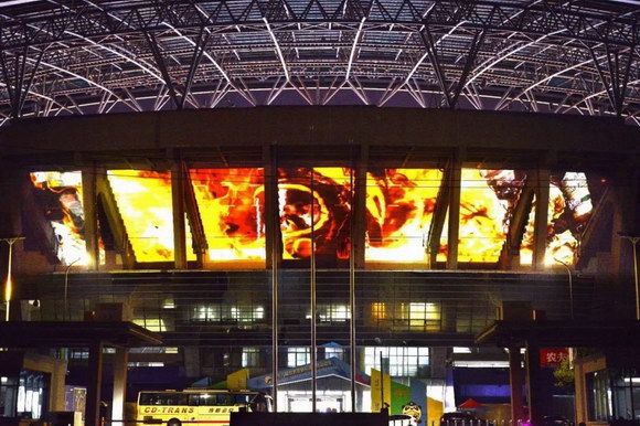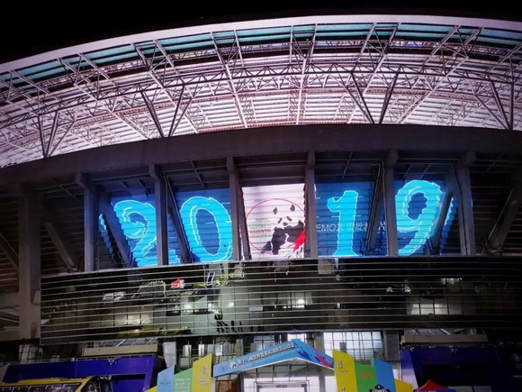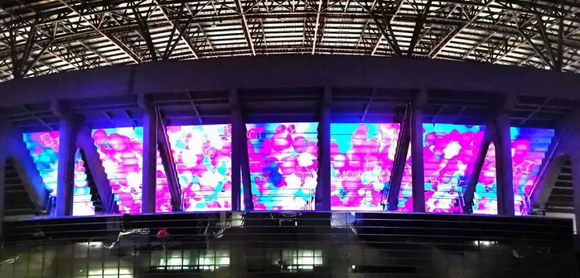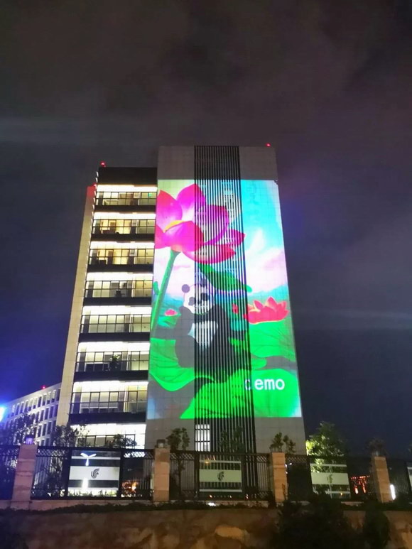 開(kāi)幕式現(xiàn)場(chǎng),成都特色與國(guó)際潮流交相輝映,利用各種視覺(jué)藝術(shù)沖擊著在場(chǎng)觀眾,投影技術(shù)作為視覺(jué)展現(xiàn)的最佳手段必不可少。雙流體育中心對(duì)入口處建筑外立面進(jìn)行亮化改造,一副巨大的動(dòng)態(tài)視頻墻赫然在目,輪番播放精彩的宣傳片等視覺(jué)內(nèi)容,讓觀眾深深地體會(huì)到場(chǎng)館現(xiàn)代化的氣息。