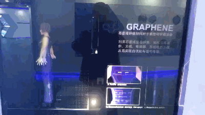 在兩個類似櫥窗的窗口中,集中展示著石墨烯的產品應用領域及最新成果,這兩個櫥窗效果正是通過投影機實現。在明亮的展廳環境中,成像效果絲毫未受影響,采用全息投影的創意顯示,畫面中物體360°展示期間,如同實物一般呈現在參觀者面前。