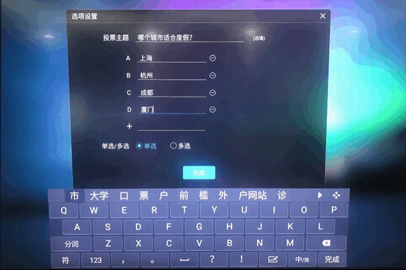 還有一個有趣的應(yīng)用是“創(chuàng)建投票”,可創(chuàng)建投票主題與選項,與會者掃碼后可在手機上選擇并提交;所有人的回答馬上可以即時匯總并顯示出來,生成條形圖或餅圖,并可直接導(dǎo)入白板之中,特別適合培訓(xùn),有效增強互動與溝通。