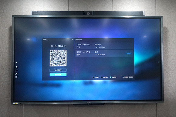 我們要組織一場會議,首先需要預(yù)約,打開newline會議平板上的預(yù)約功能,可以直接進(jìn)行本機預(yù)約,填入信息即可,也可用手機掃描二維碼預(yù)約,已預(yù)約會議信息顯示在右側(cè)。
