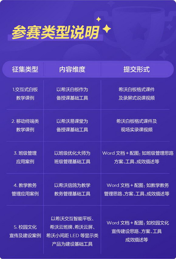 隨著老師們對于信息技術的應用范圍越來越廣,今年的大賽征集作品根據不同的應用情況,特分為五個類型:交互式白板教學課例、移動終端類教學課例、班級管理應用案例、教學教務管理應用案例、校園文化宣傳及建設案例。