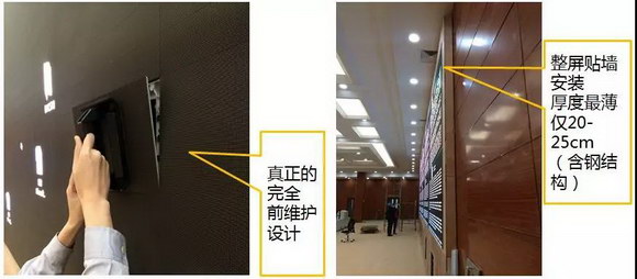 充分考慮到用戶室內使用時對維護空間需求,臺達小間距LED采用真正的前維護安裝設計,此項設計明顯有別于市場上的“模塊前維護設計”,不僅顯示模組可以進行屏前安裝、維護,甚至包括顯示箱體內部的控制系統、電源系統等所有零部件都完全實現了屏前維護。只需通過精準的磁吸式維護工具進行拆卸維護,操作簡單易控,無需預留維護空間。無需背部專門的維護通道,為用戶節約了大量空間,也從實際上體現了小間距LED產品超薄貼墻壁掛的設計意義。