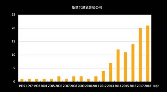 在過去5年內,沉浸式體驗設計公司層出不窮,保持著平均每年20%的增長。過去一年,北美地區有 700個新的沉浸式項目創作面世,這些數據都從側面證明了這個行業未來發展的潛力。