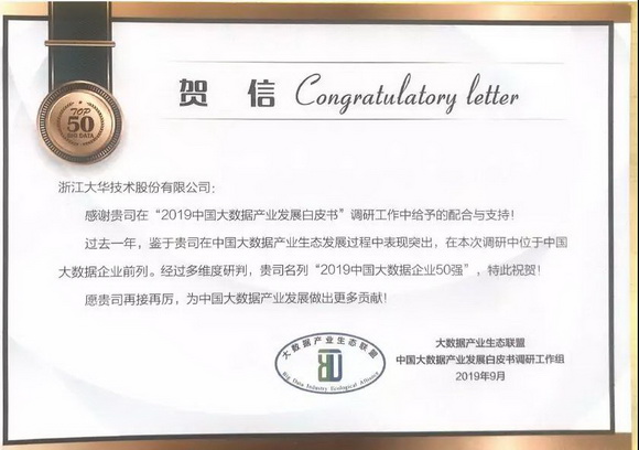 “2019中國大數據企業50強”由政府主管部門、大數據產業資深專家、名企CIO、高校、研究機構、投資人專家共同組成專家委員會,從大數據產品、解決方案、應用案例、投融資需求及發展潛力等多個維度對大數據企業進行考核評審產生。大華股份以卓越的實力脫穎而出,一舉入圍榜單,標志著大華股份已成為我國大數據產業發展與應用的中堅力量。