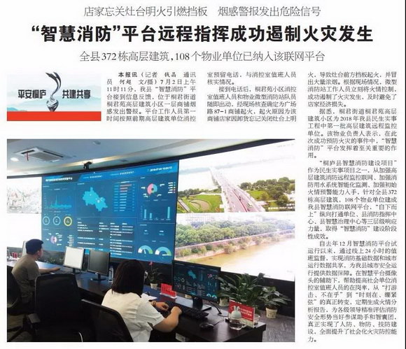 在浙江桐廬,全縣372棟高層建筑和108個物業單位已經納入“智慧消防”聯網平臺,通過安消一體化,多維感知、聯動報警。曾經有經商店家忘記關閉灶臺明火,短時間就引燃擋板,感知設備成功報警,滅火措施迅速跟進,阻止了一場燃燒事故。