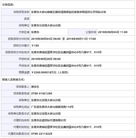 > 東莞市大嶺山鎮第五期高清視頻監控系統采購項目公開招標公告