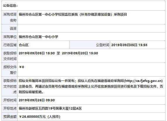 > 福州市倉山區(qū)第一中心小學(xué)校園監(jiān)控系統(tǒng)(補(bǔ)充存儲及增加設(shè)備)采購項(xiàng)目招標(biāo)公告